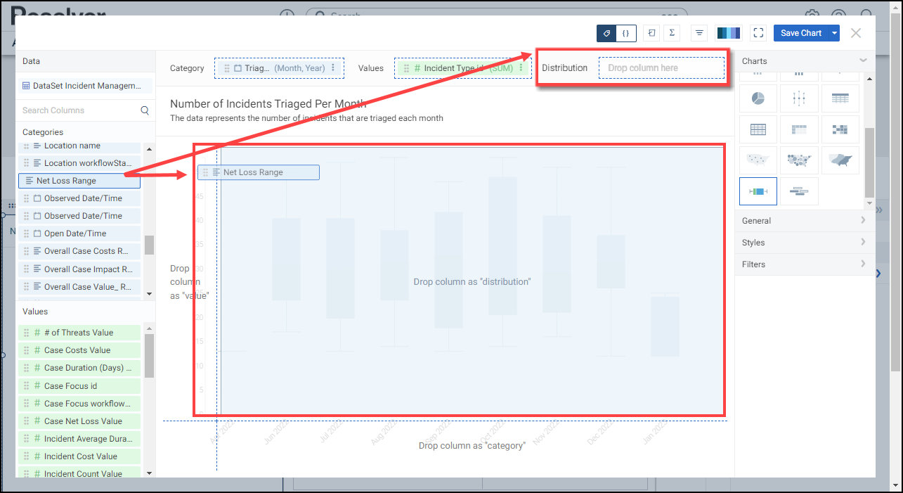 - (Optional) Drag and drop a Category or Value from the Data Panel onto the Distribution area on the left of the Chart or within the Distribution field. The Distribution field defines a mean when non-numeric Categories and Values are loaded in the Category and Values fields.