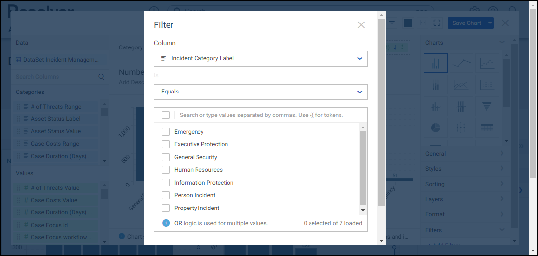 Equals: The Equals Condition is met if a value(s) on the Chart equals the Text Value(s) selected (e.g., equals Person Incident).