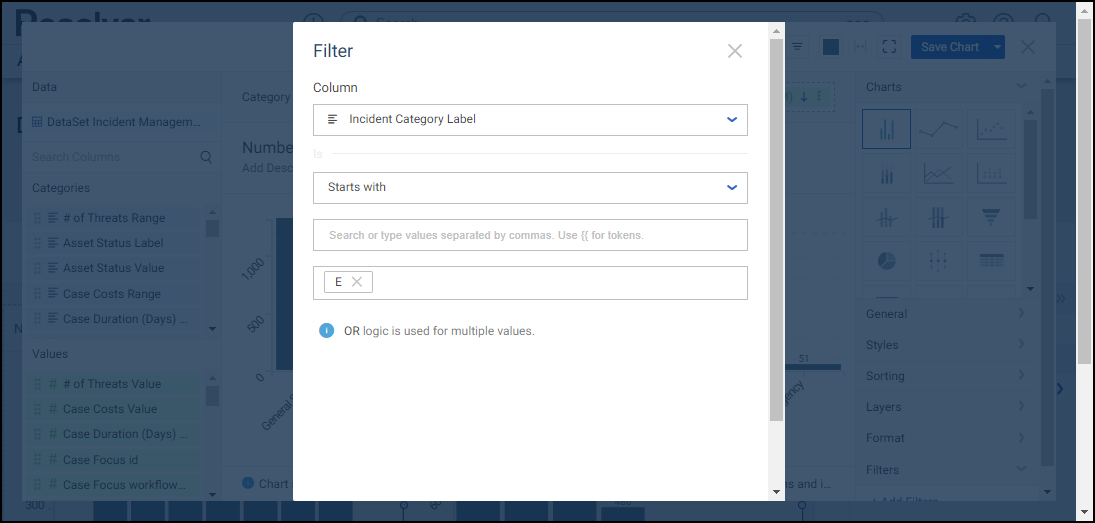 Starts with: If a value(s) on the Chart starts with the Text Value entered, the Condition is met (e.g., starts with "e" = Emergency).