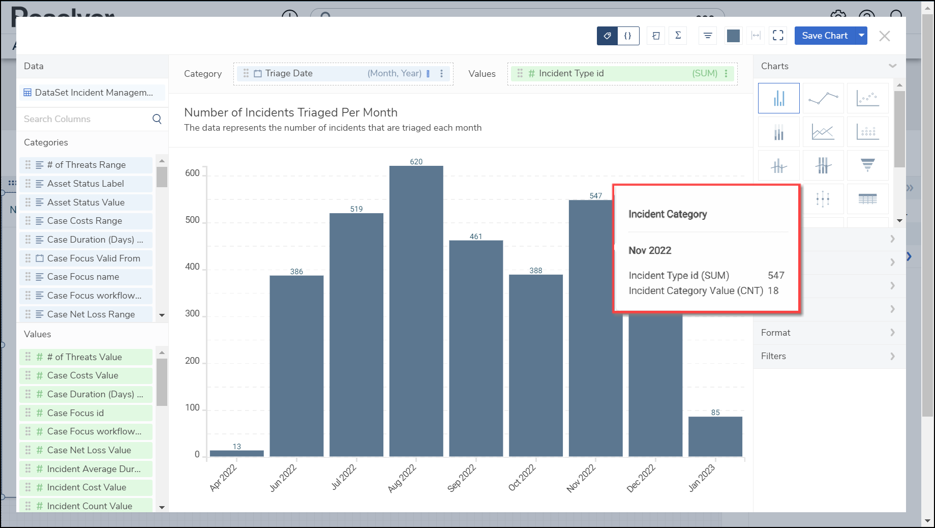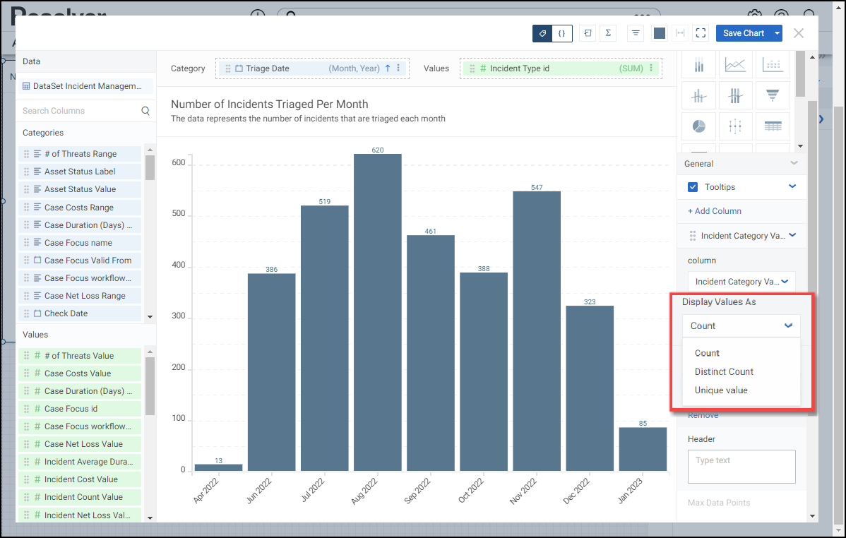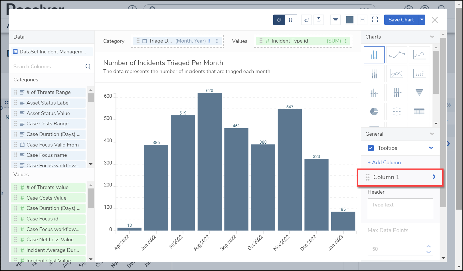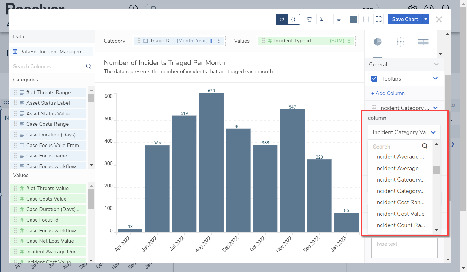 Users can create Tooltips that appear as a pop-up when they hover their cursor over a Chart data point. By default, the Tooltip pop-up displays the same data used to generate each data point in the Chart. If the data point value for a specific bar in a Chart is 100, then the Tooltip will display 100 as well. Users can customize the data values displayed in the Tooltip by adding one or more Tooltip columns that map to other fields in the selected dataset.