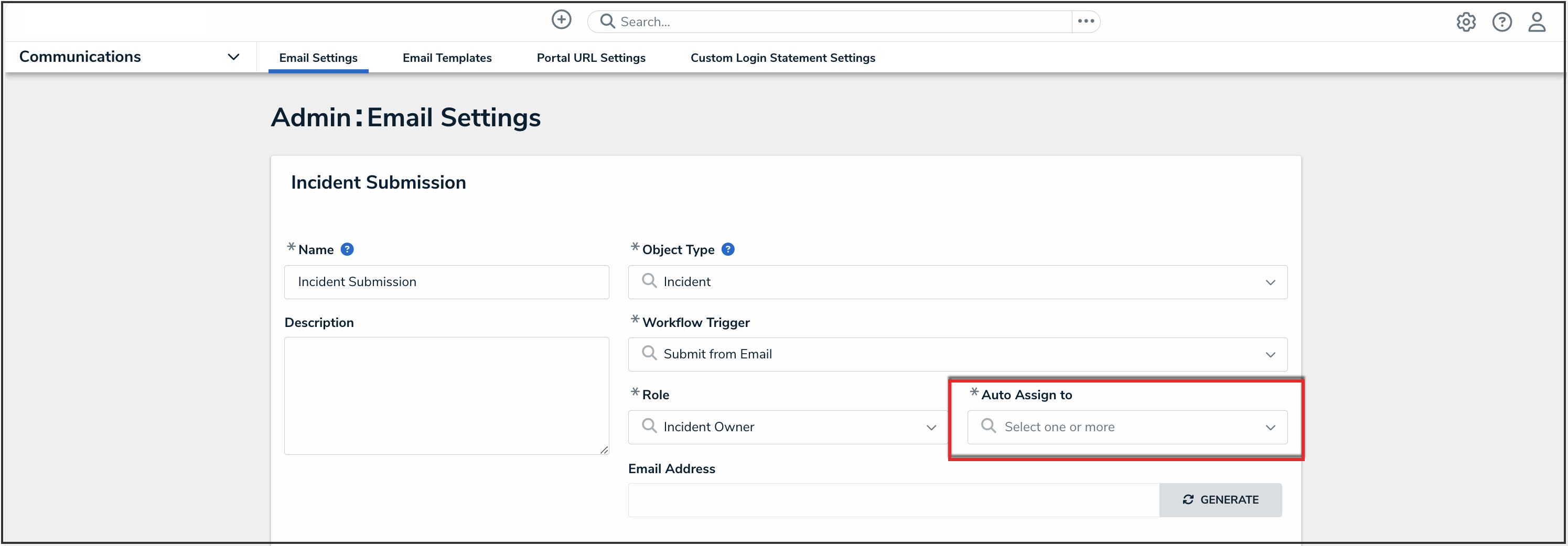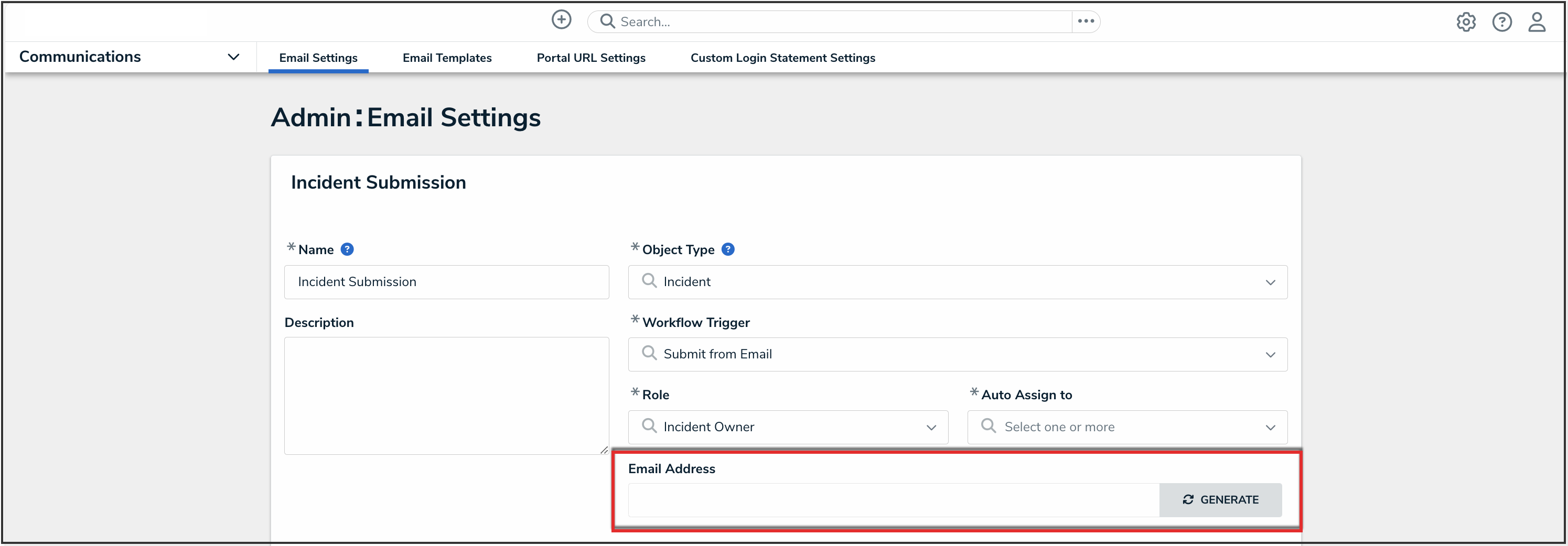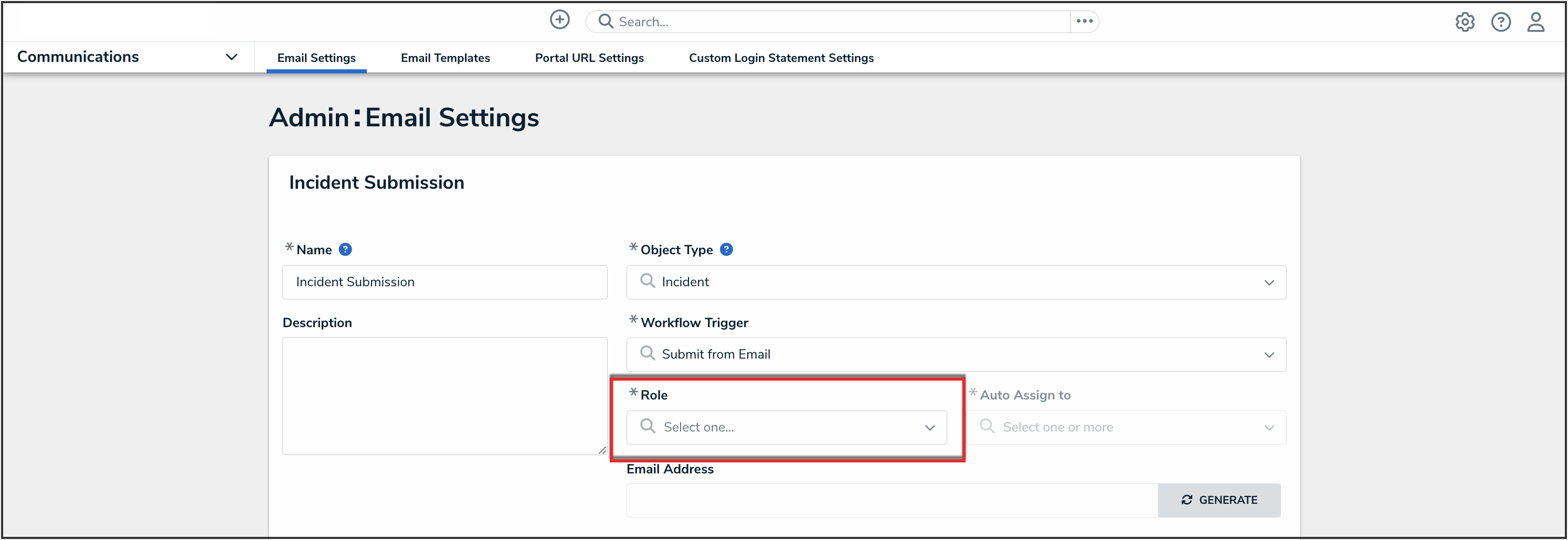 An email address can only be generated once an Administrator selects an object type, workflow trigger, role, and user assignment. Entering information into these fields determines what type of object gets generated by this email address and what happens after creation.