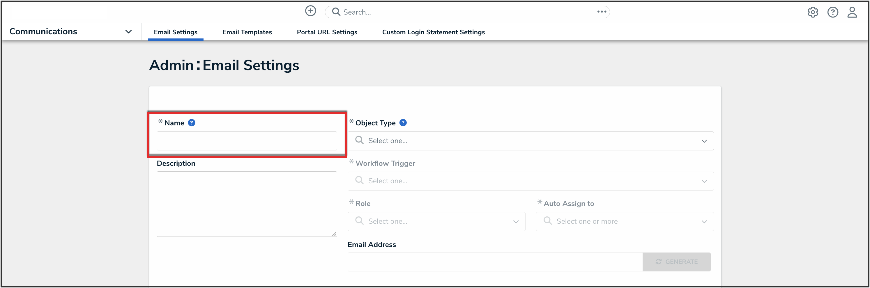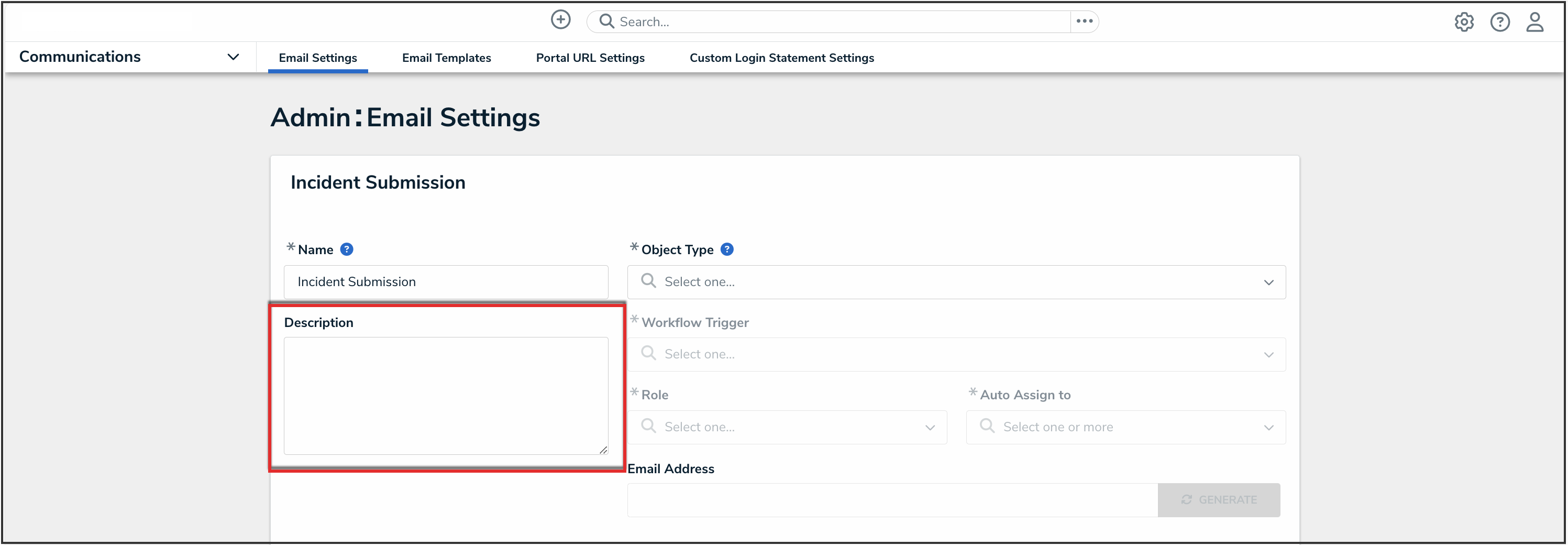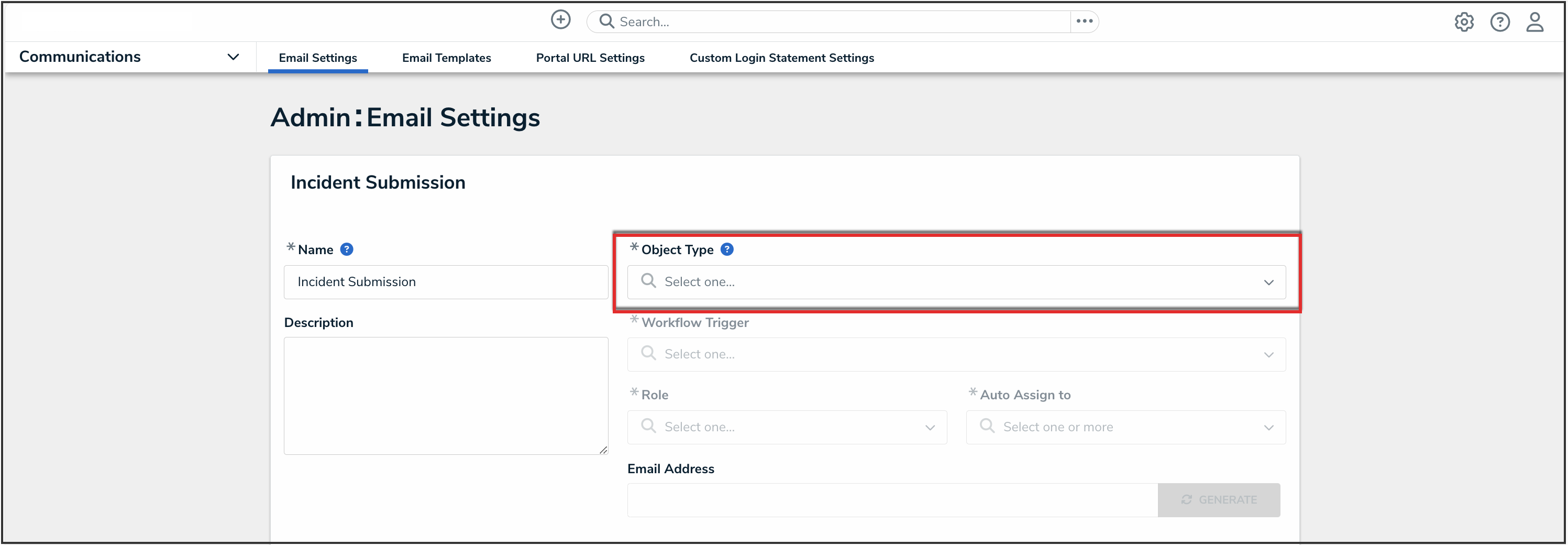 An email address can only be generated once an Administrator selects an object type, workflow trigger, role, and user assignment. Entering information into these fields determines what type of object gets generated by this email address and what happens after creation.