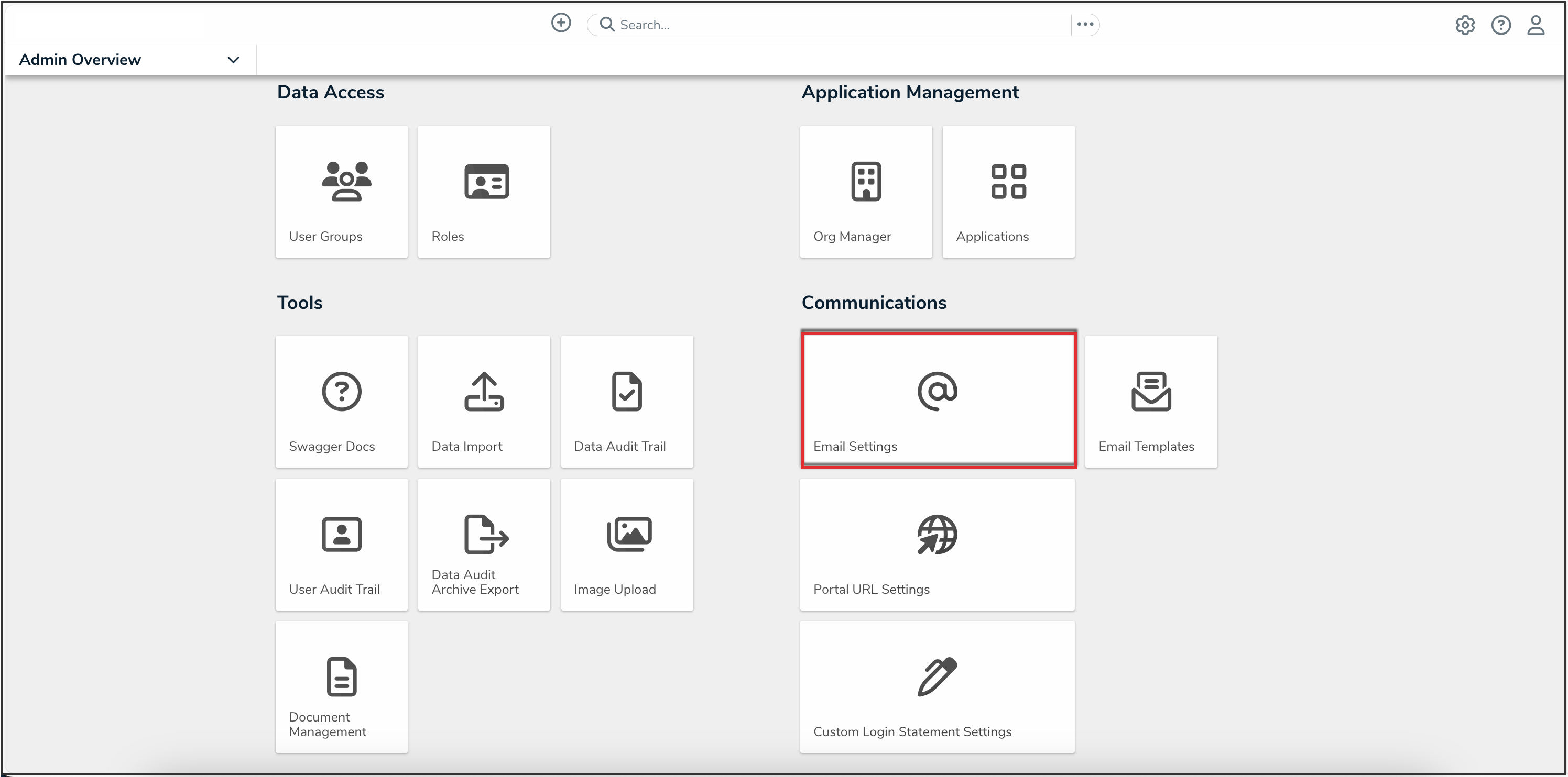 - From the Admin Overview screen, click the Email Settings tile under the Communications section.
