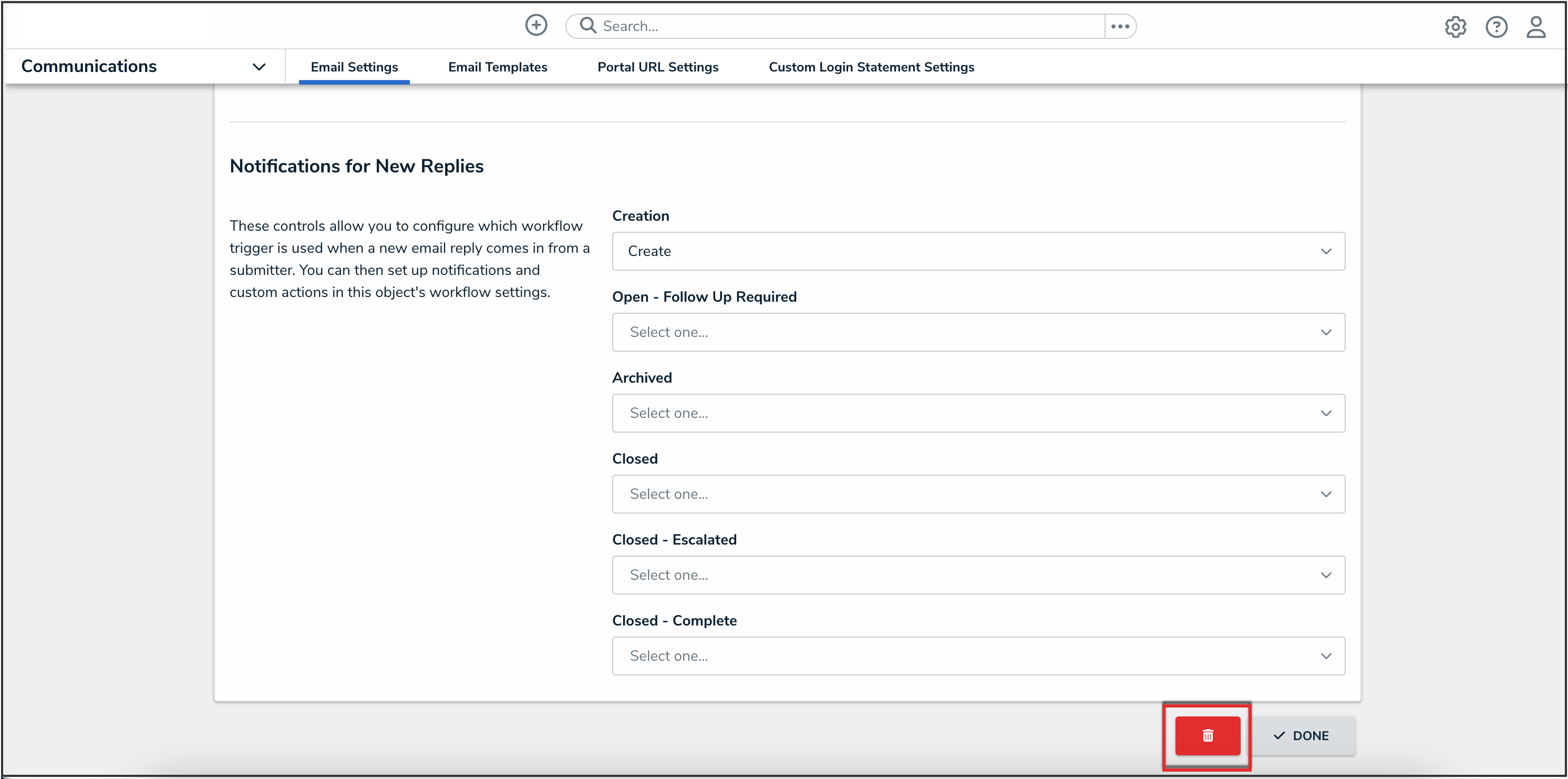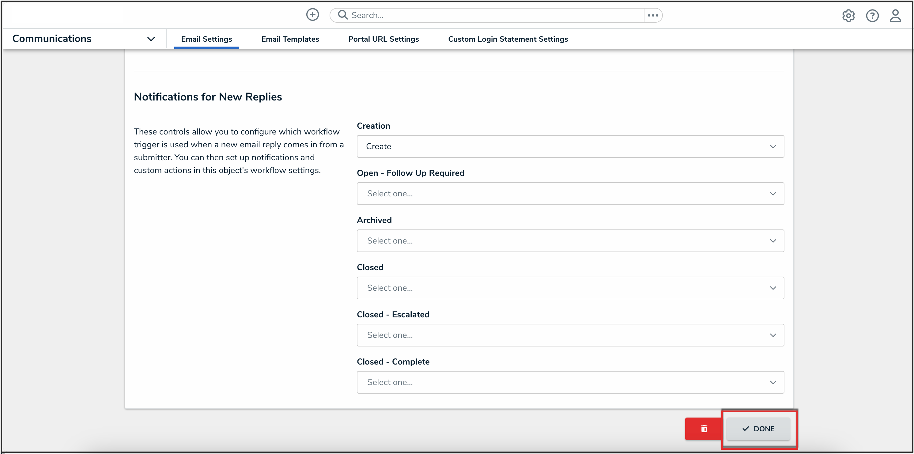 - Scroll to the Notification for New Replies section to customize a state's action and indicate which workflow trigger is initiated based on email replies from a submitter. The state fields on the Notification for New Replies section will differ based on the object type selected in the Object Type field.