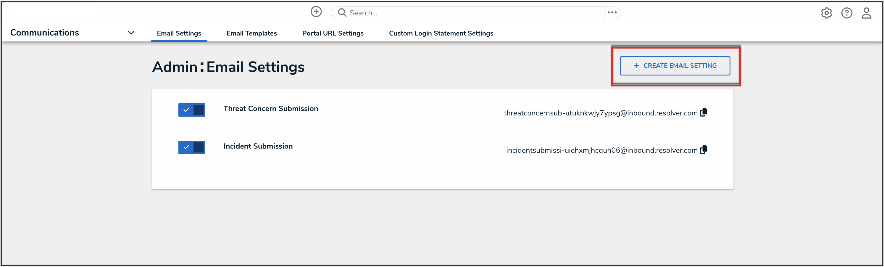 - From the Email Settings screen, click the Create Email Setting button.
