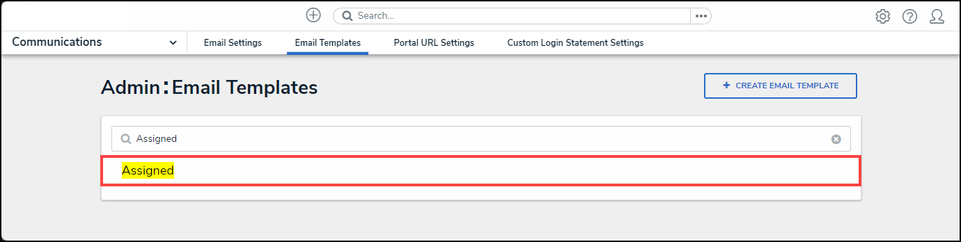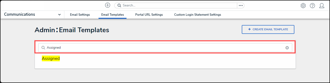 - From the Admin: Email Template screen, enter an email template name Standard or Assigned in the Search field to narrow the search results.