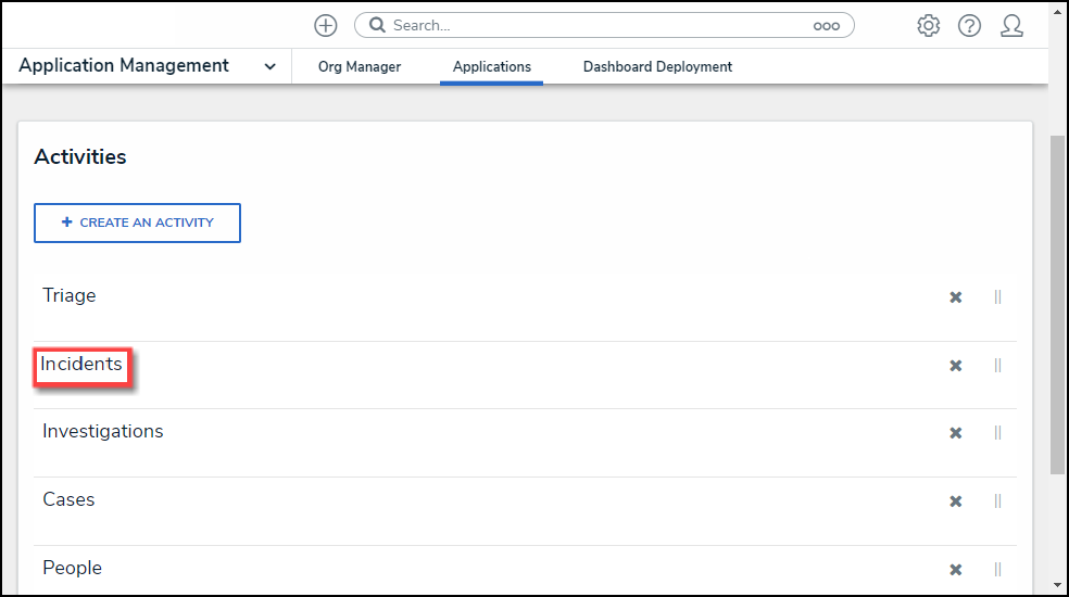 - From the Admin Edit Applications screen, scroll to the Activity and click the Activity Name you want to embed a Dashboard from the Activities section.