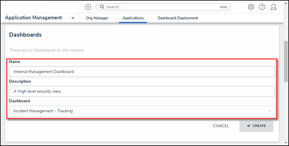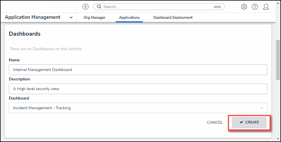 - Click the Create button to add the Dashboard to the Activity.