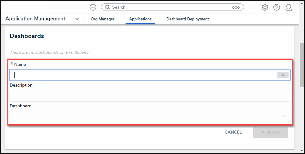 - Name: Enter a name to represent the Dashboard within the system. The Dashboard Name will appear on the Edit Activity screen under the Dashboard section.