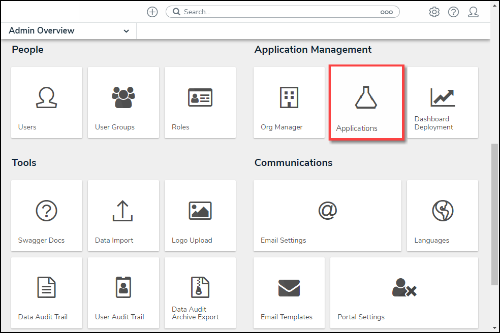 - From the Admin Overview screen, click on the Applications tile under the Application Management section.