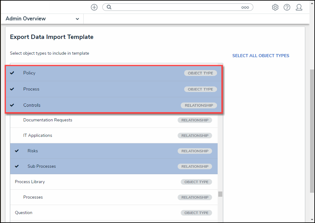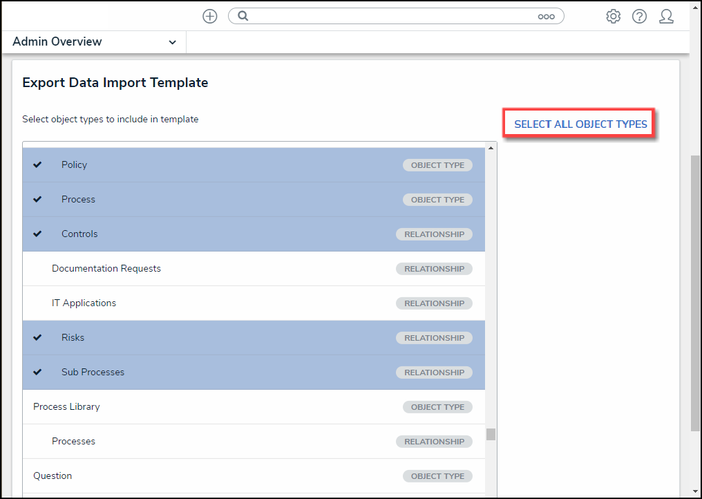 | Note: The more Object Types and Relationships selected will increase the time to generate the Data Import Template. |