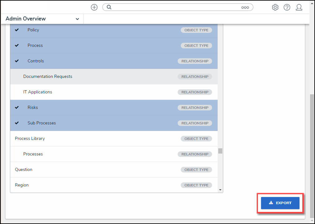 - Select the Object Types and Relationship you want to export by clicking the Name link. An Object Type and Relationship is highlighted, and a checkmark will appear to the left of the Name when selected.