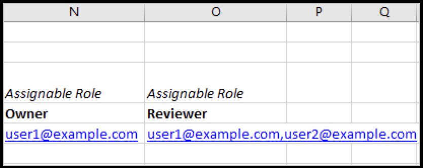 Under the column Assignable Role (e.g., Columns N or O below), enter the relevant users’ email addresses.