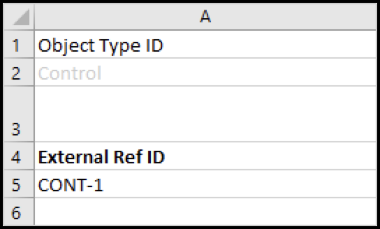 - On the spreadsheet (Row 5 Column A), below the External Ref ID heading, enter a name or code to identify the object in the system.