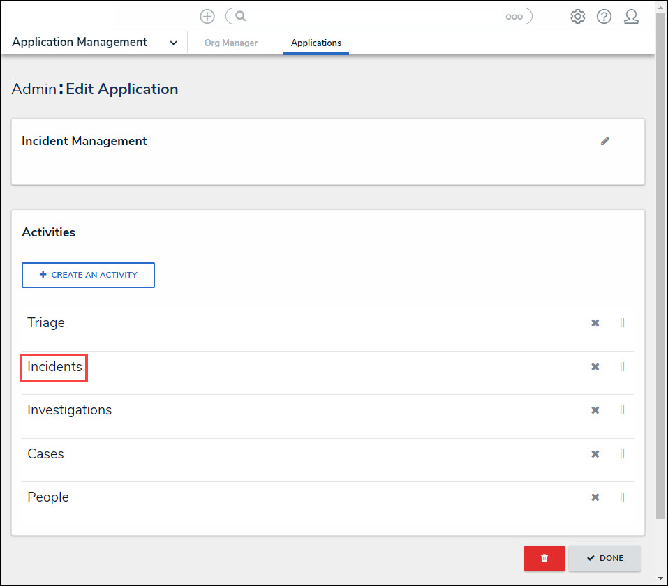 From the Admin Edit Application screen, click an Activity.