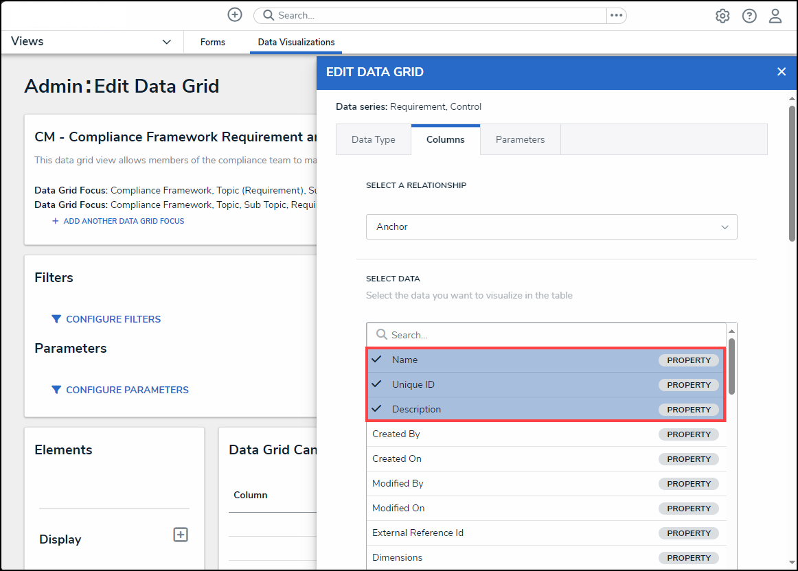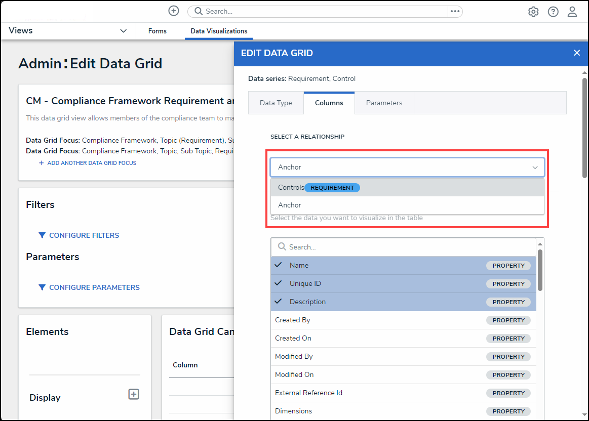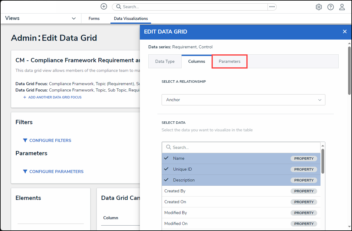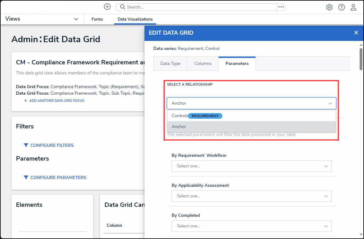 - From the Parameters tab, select a relationship from the Select a Relationship dropdown menu. The relationship selected controls the data that appears on the Select Data dropdown menu.