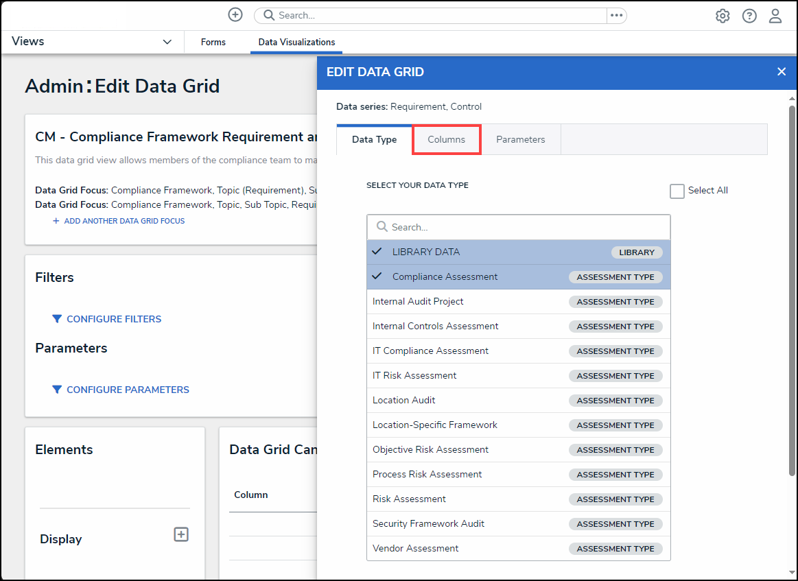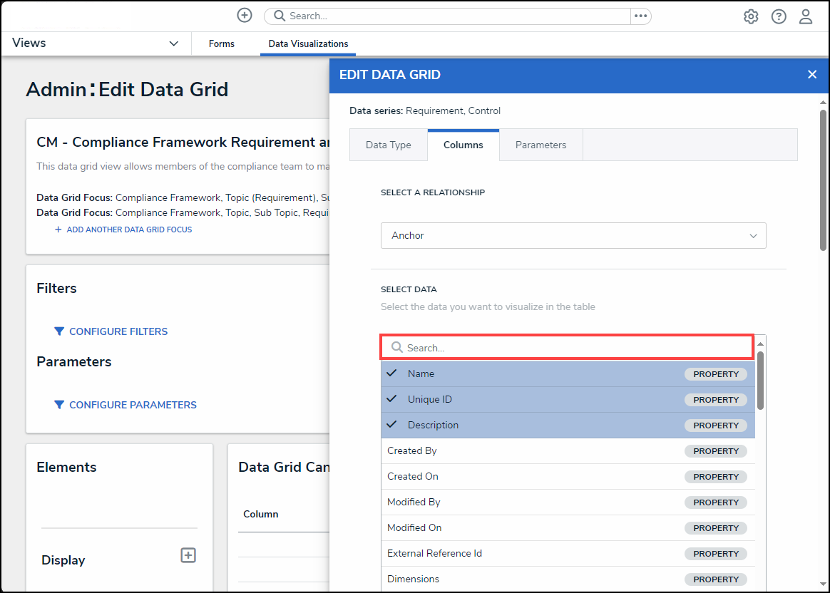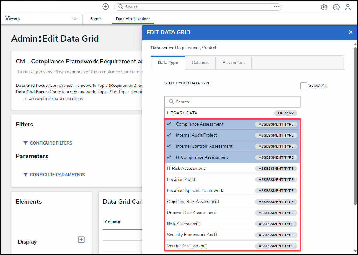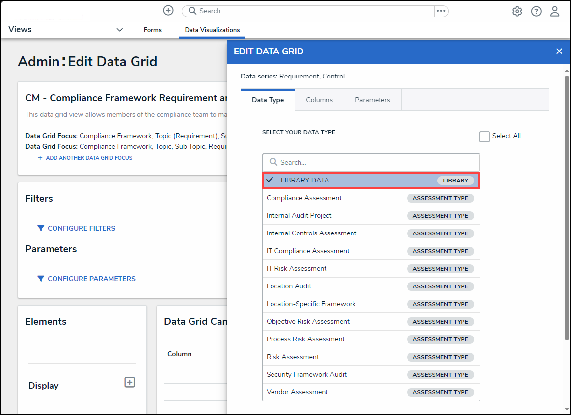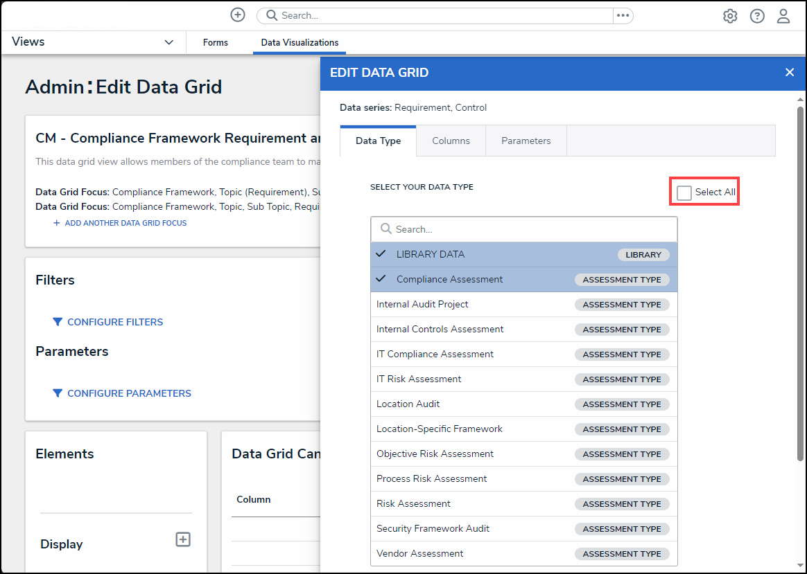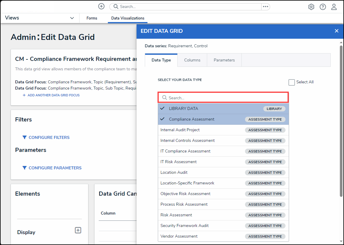 - From the Data Type tab on the Edit Data Grid pop-up, enter a Data Type name in the Search field to narrow the results on the Select Your Data Type list.