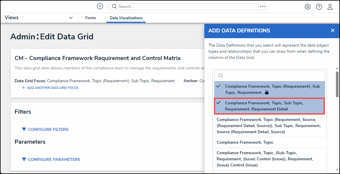 - Once you have selected all focus data definitions, scroll to the bottom of the Add Data Definitions pop-up.
