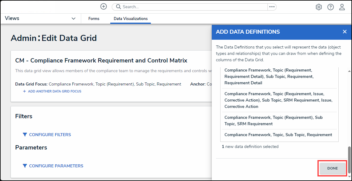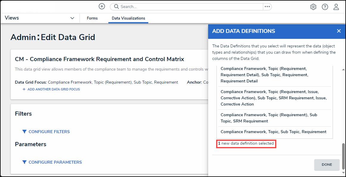 - Click on the Done button to exit the Add Data Definition pop-up and return to the Admin: Edit Data Grid screen.