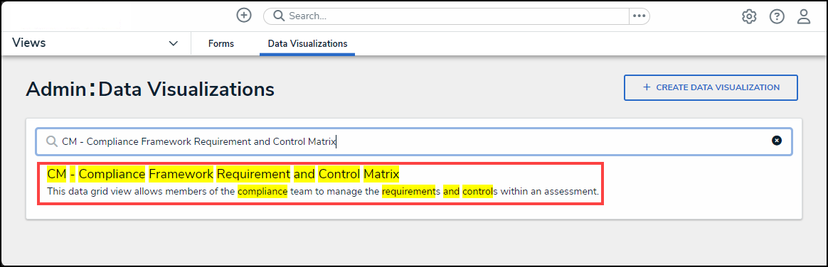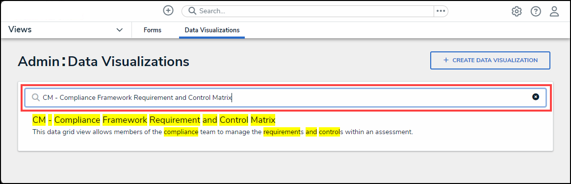 - From the Admin: Data Visualizations screen, enter a keyword in the Search field to narrow the search results list.