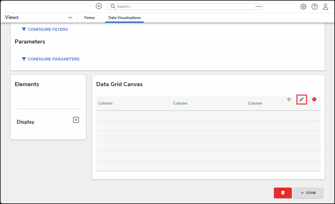 - From the Admin: Edit Data Grid screen, hover the cursor over the Data Grid Canvas and click the Edit icon.