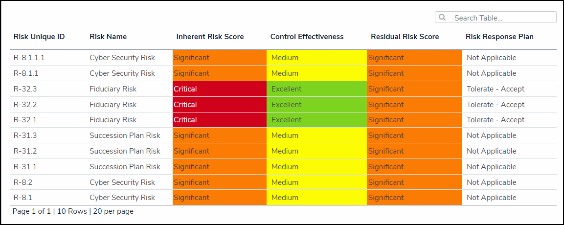 - By Formula Range: Filter the table data by formula range (e.g., Low, Medium, High). A Formula uses numeric and variable values (e.g., select lists, numeric or date fields, or workflow states) to generate Incident Severity, Estimated Damage, or Incident Likelihood. Formulas are added to an Object Type through a Relationship or Reference.
