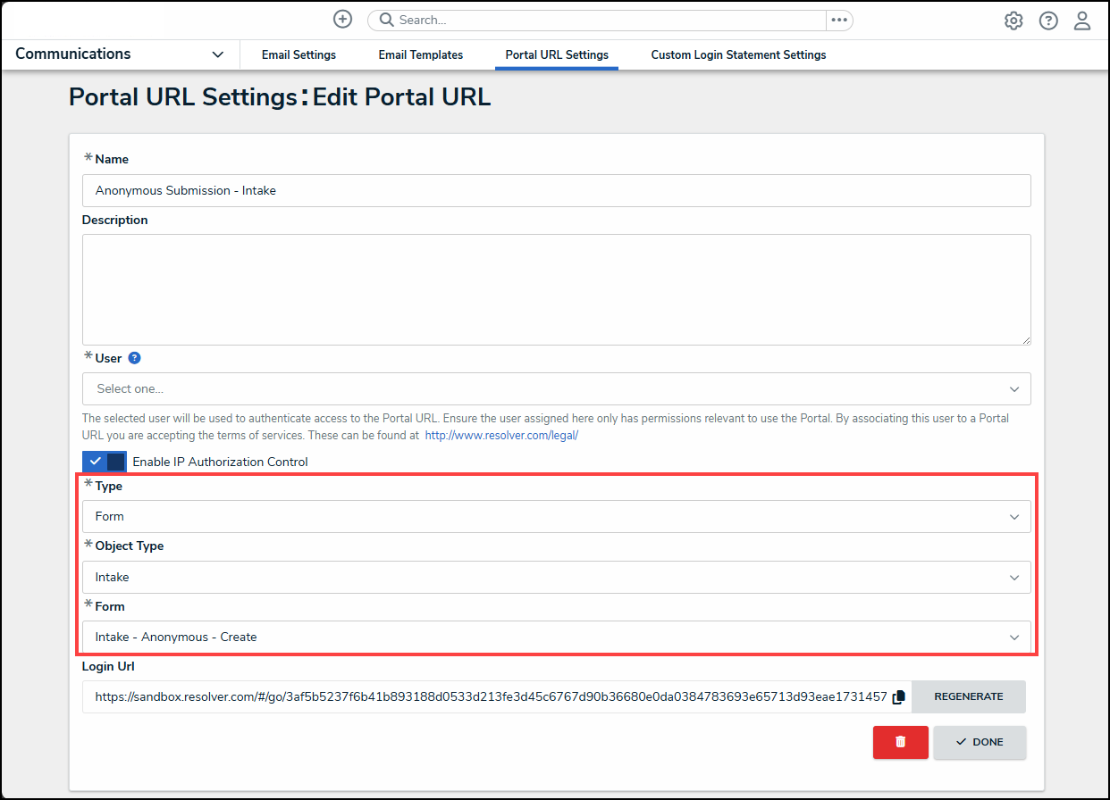 - Form: Select a Form from the Form dropdown menu. The Form selected will appear when accessing the Confidential Portal.