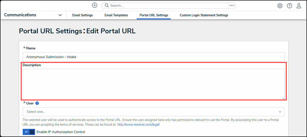 - Click the User field and select a user from the dropdown menu. This list will only show users with the Portal URL User option selected on the User Type field on the User Management: Edit User screen.