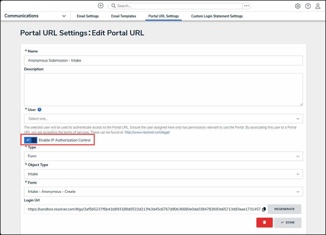 - Click the Enable IP Authorization Control toggle switch to restrict who can access this URL (based on the entries in the IP allow list).
