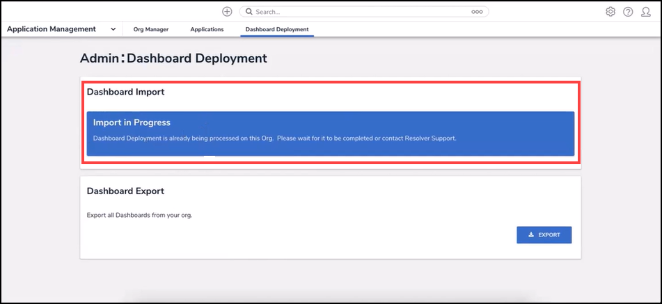 - When an Administrator is importing a Dashboard and another Administrator attempts to import a Dashboard, the Admin: Dashboard Deployment screen will indicate that another import is in progress, and you must wait for the first import to complete before attempting to import another Dashboard.