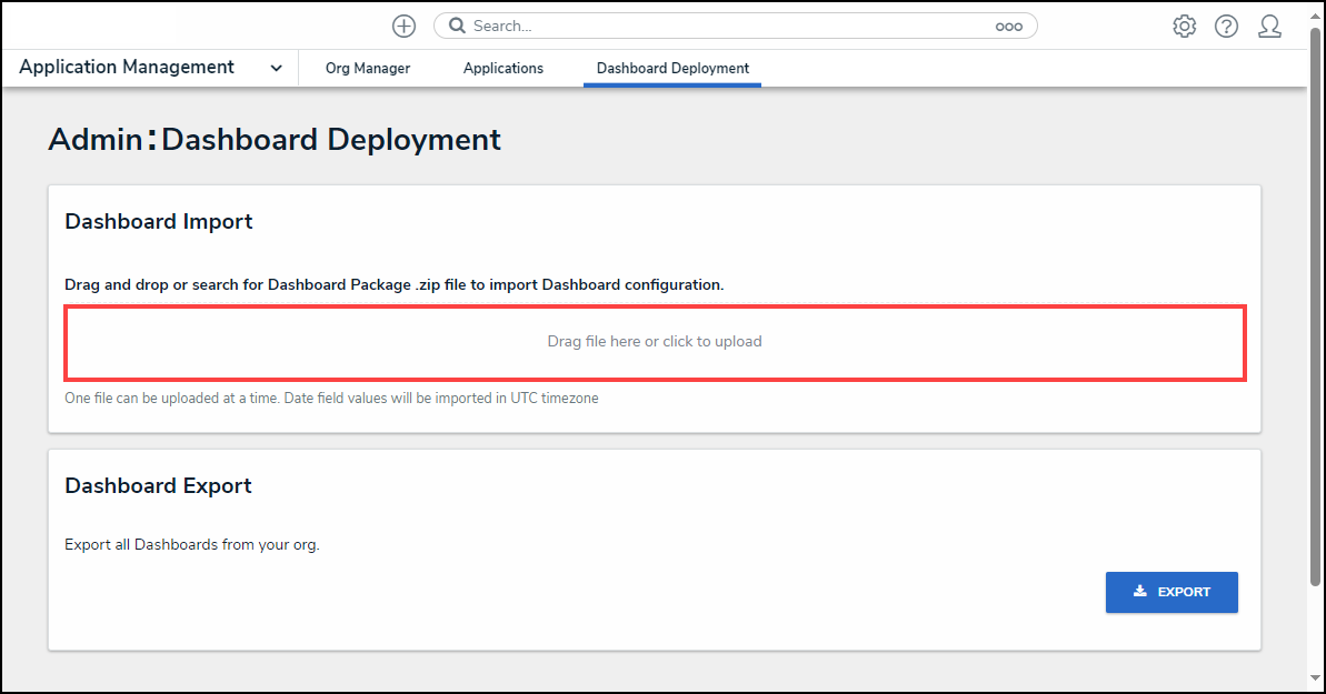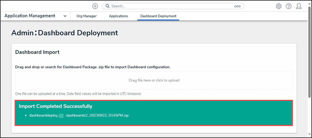 | Note: When processing a Dashboard Import, you can navigate away from the Admin: Dashboard Deployment screen and the import will continue without keeping the screen open. |
