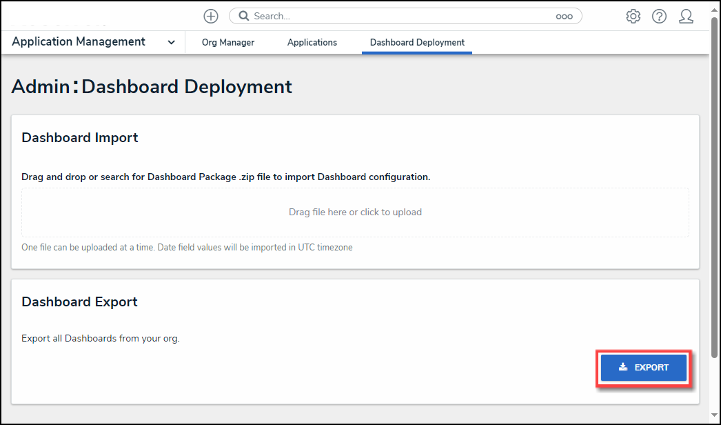 - From the Admin: Dashboard Deployment screen, click the Export button on the Dashboards Export section.