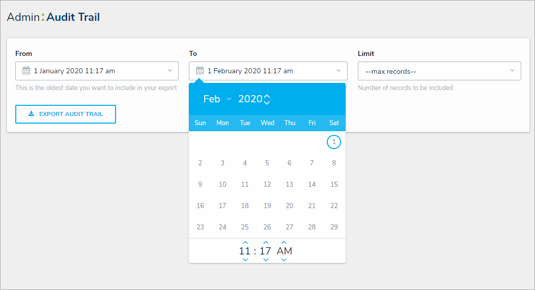 - Select a start date and end date using the From and To fields to define your time range.The Data Management Audit Trail page.
