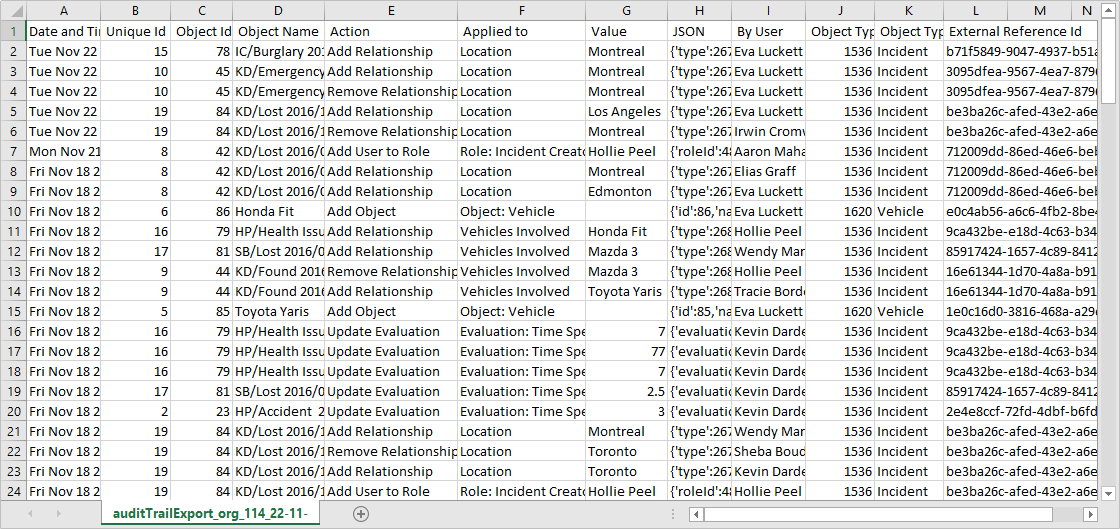 Action: The object change(s) the user or system initiated (e.g., Update Object, Add Object, Remove Relationship). If Evaluation appears in this column, it indicates a field value change.