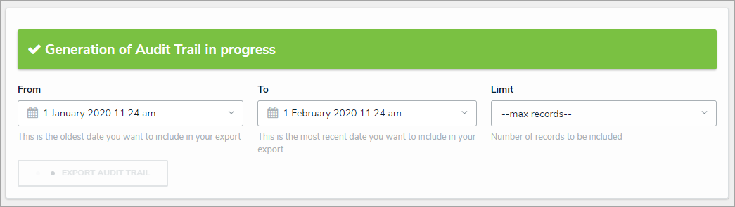 - Click Export Audit Trail to generate the spreadsheet. Once successful, your browser automatically begins the file download.Generating an audit trail spreadsheet.