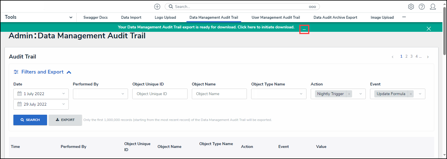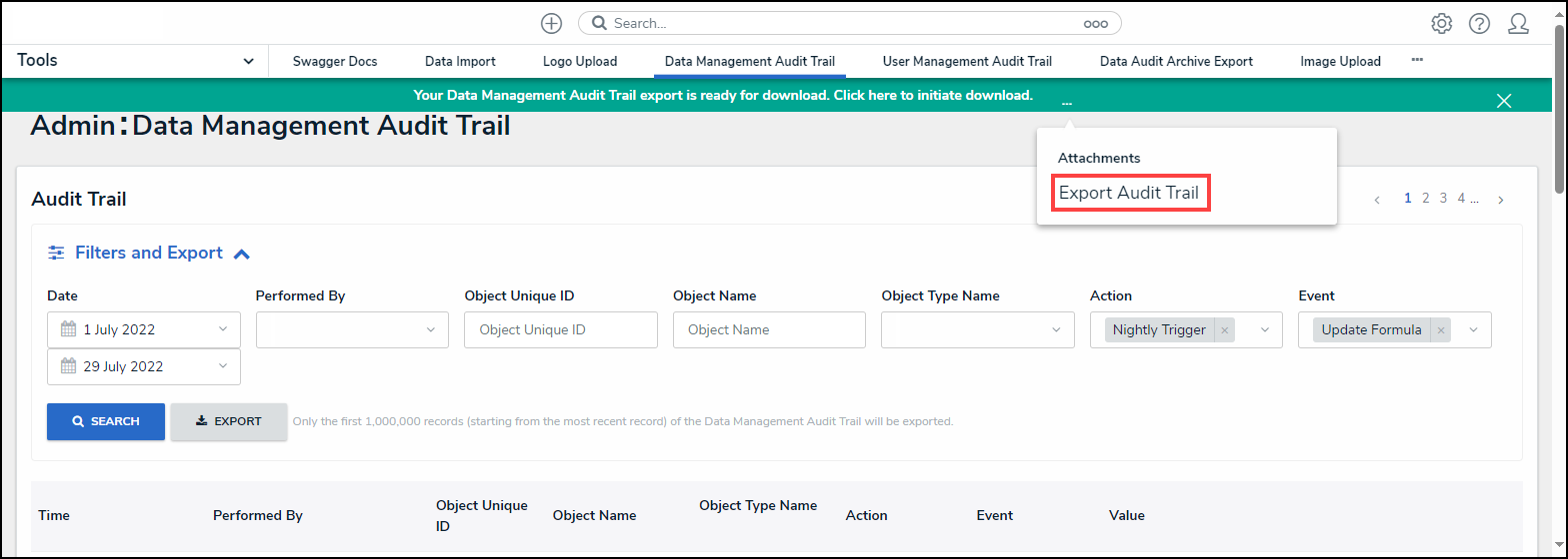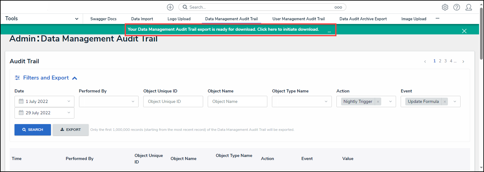 - When you have the search results you want to export, click the Export button. Only the first 1,000,000 records (starting from the most recent record) of the Data Management Audit Trail will be exported.