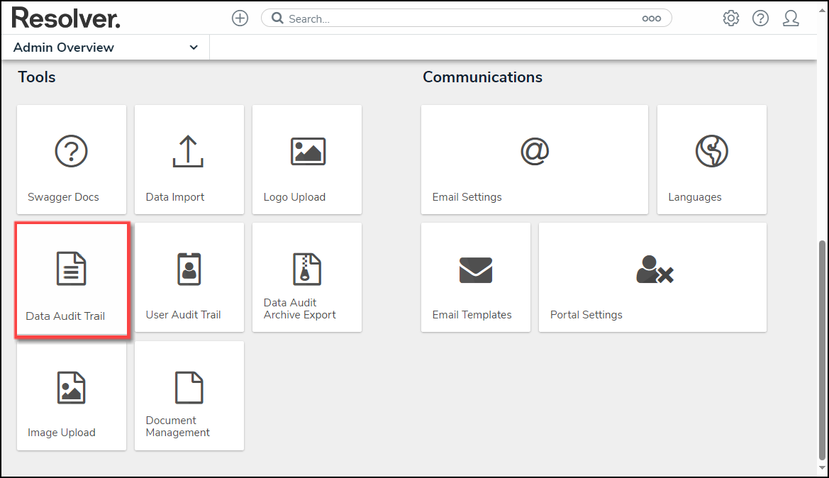 - From the Admin: Overview screen, click the Audit Data Trail tile under the Tools section.
