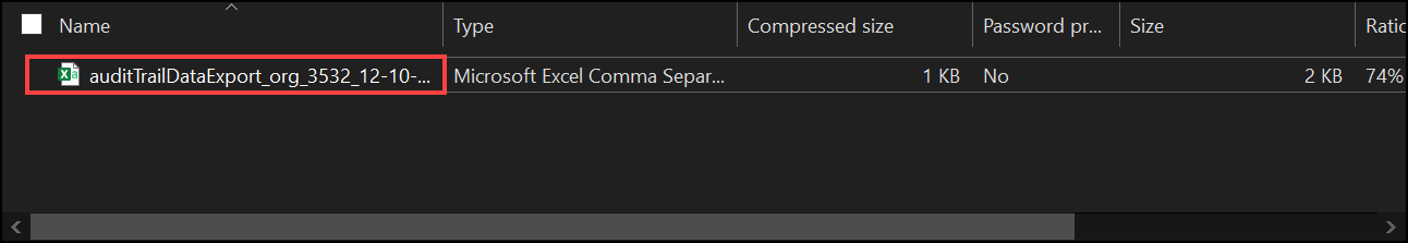 - Click the Audit Trail Data Export file. The file will use the following naming convention auditTrailDataExport_(orgID)_Date_Time.