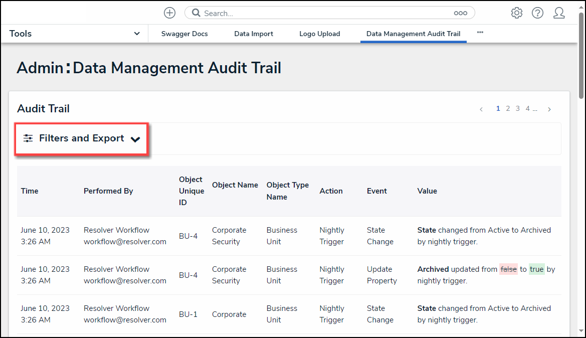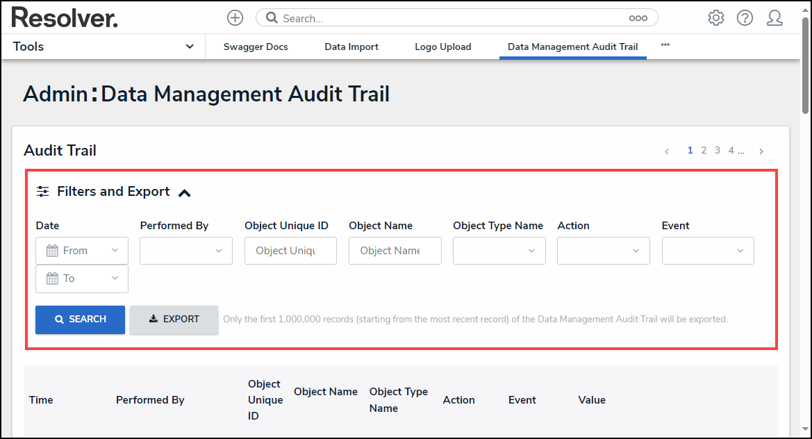 The user account you use to log into Resolver must have Administrator permission to use the Data Management Audit Trail feature.
