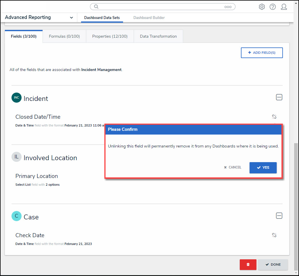 - Click the Yes button to remove a Field, Formula, or Property from the Dashboard Data Set. Unlinking a Field, formula, or Property does not unlink it from that Object Type in Resolver.