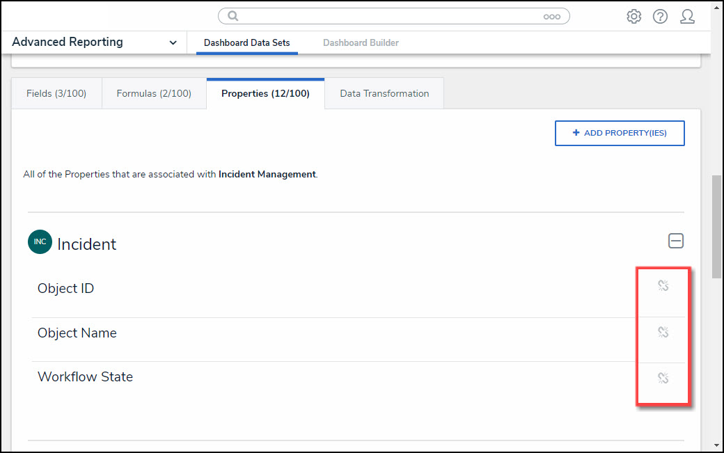 Preselected Properties (e.g., Object Name and Workflow State) support underlying tables that drive the Dashboard Data Set. Preselected Properties cannot be unlinked from the Dashboard Data Set. The Unlink Icon will be greyed out for these Properties.