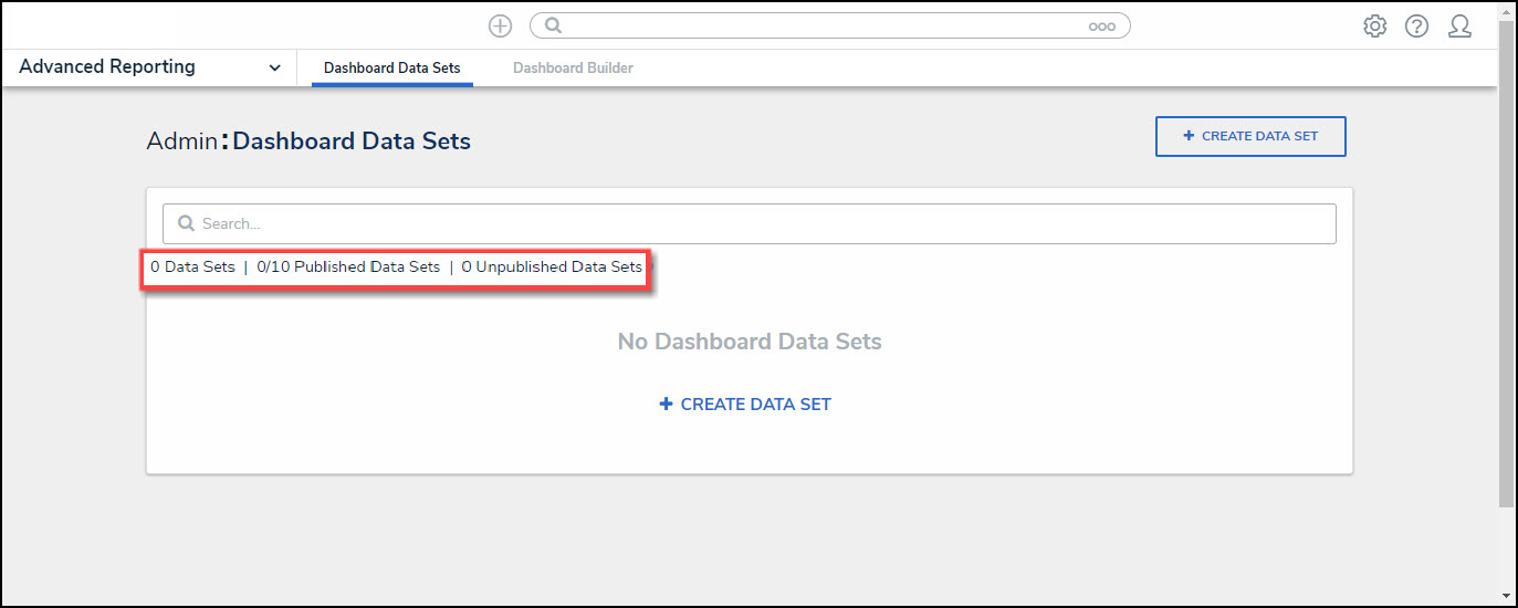 - Published Data Sets: The total number of published Dashboard Data Sets that can be used within the Dashboard Builder. Published Dashboard Data Sets will be out of 10. By default, the maximum number of Dashboard Data Sets you can have Published is 10, however, depending on contract details the total number of Published Dashboards may vary.