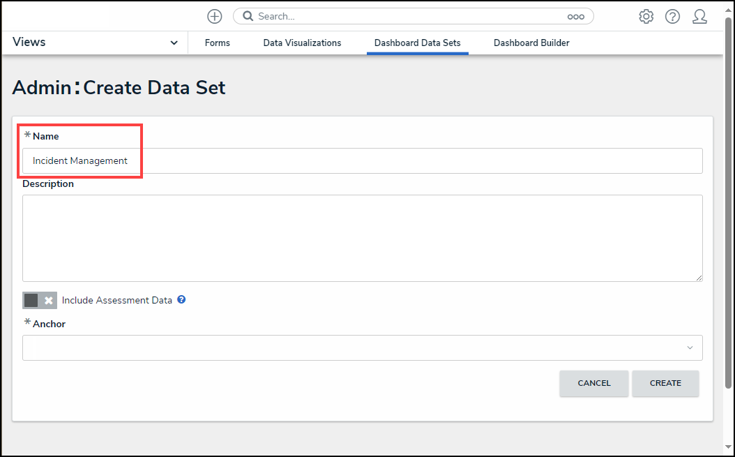 - From the Create Data Set screen, enter a Dashboard Data Set Name in the Name field. The Dashboard Data Set Name is used to identify the Dashboard Data Set within the system.