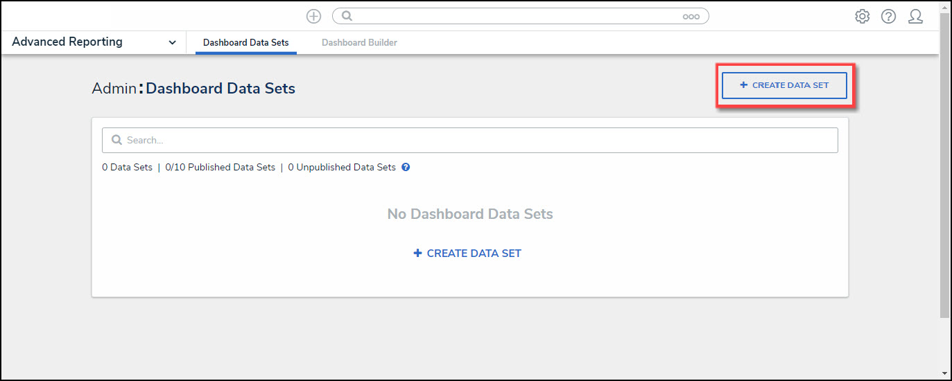- Click the + Create Data Set button. If there are no Dashboard Data Sets in the system, a + Create Data Set link will appear.