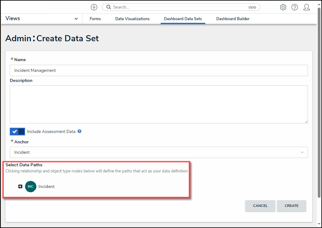 Resolver's Dashboard Data Set feature allows users to build a Dashboard Data Path using the Object Types they would like to include on their Dashboards.