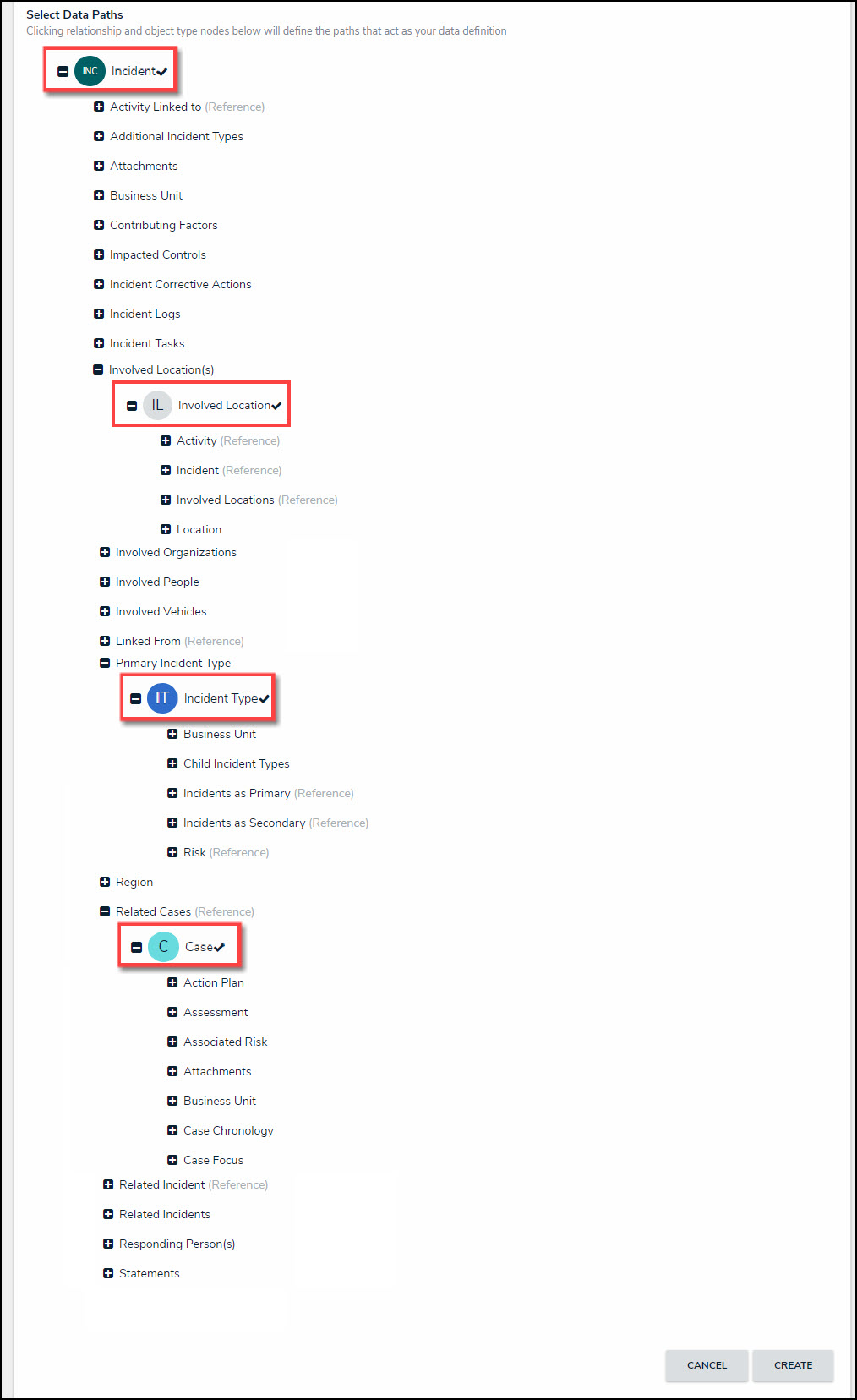 - Define a Data Path by selecting Objects (e.g., Object Types, Relationships, and References) associated with the Anchor Object Type on the navigation tree. Object Types, Relationships, and References selected on the navigation tree will be included in the Dashboard Data Set and appear on the Dashboard.