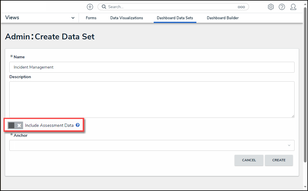 Note: The Include Assessment Data toggle switch cannot be enabled or disabled after a Data Set is created. |