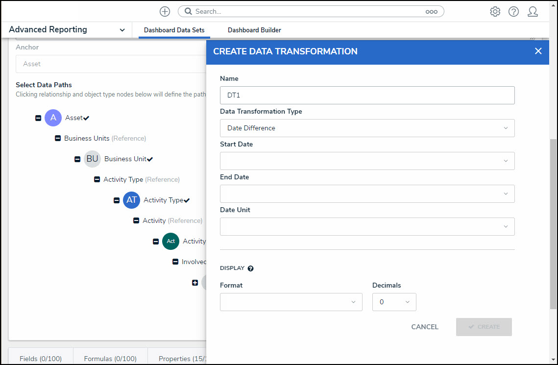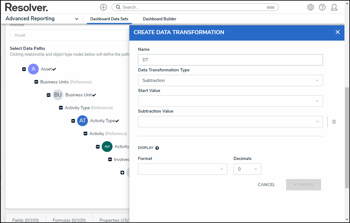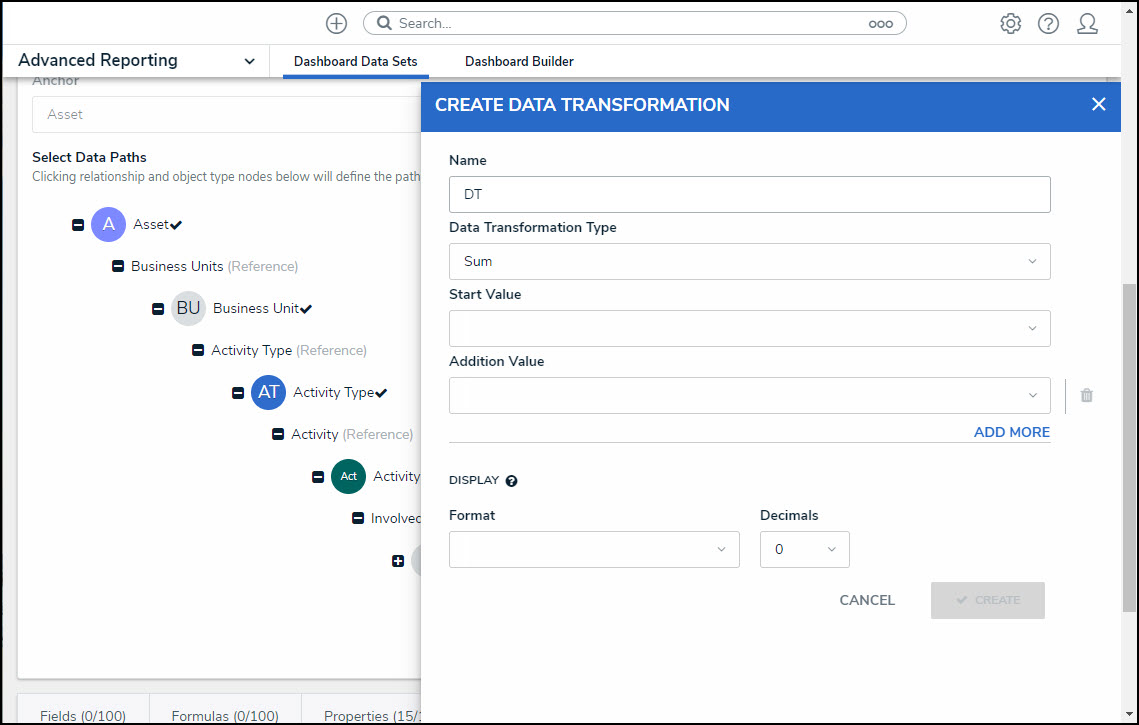 Data Transformations generate new fields for a Dashboard by performing basic calculations between two or more Fields, Formulas, or Properties in the Dashboard Data Set. Users can only leverage Fields, Formulas, or Properties within the Data Set when adding Data Transformations.