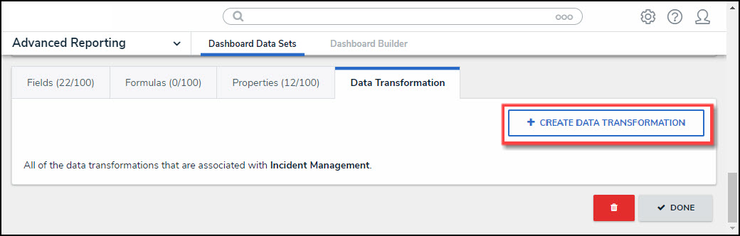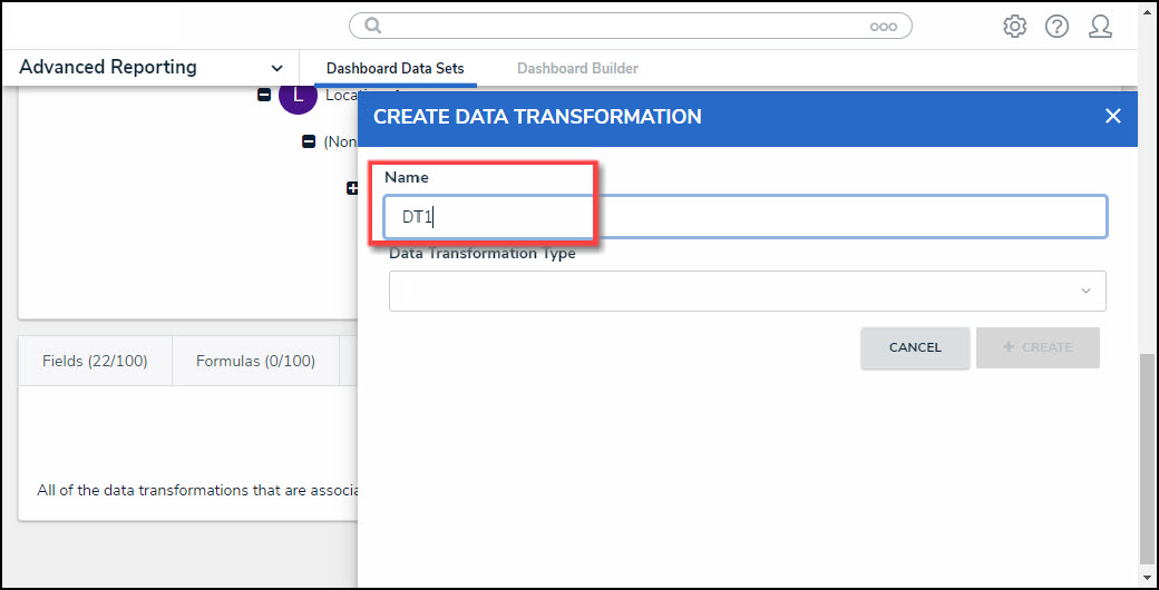 - Click the Create button to add the Data Transformation to the Dashboard Data Set. The Data Transformation Type field is locked down and cannot be modified when a Data Transformation is created. The user must delete the Data Transformation and create a new one to change the Data Transformation Type field.
