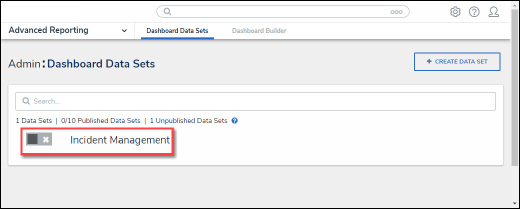- Unpublished Data Sets: The total number of unpublished Dashboard Data Sets. Unpublished Dashboard Data Sets cannot be used within the Dashboard Builder.